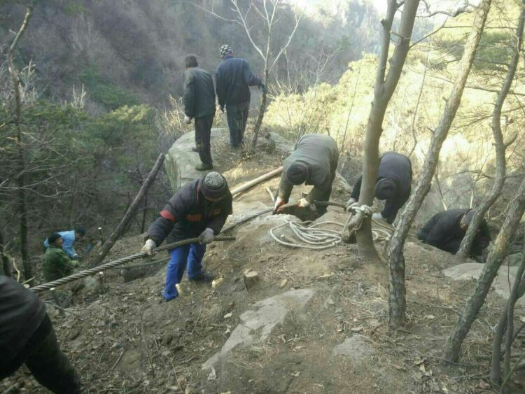 因貨索沒建好,工地又要急著開工,施工用設(shè)備全靠人力從山腳搬運(yùn)至海拔1000多米的山頂。