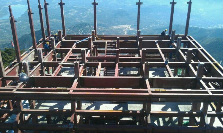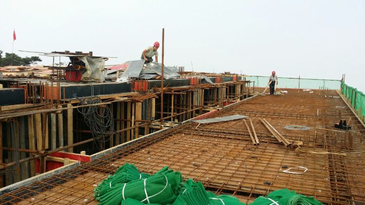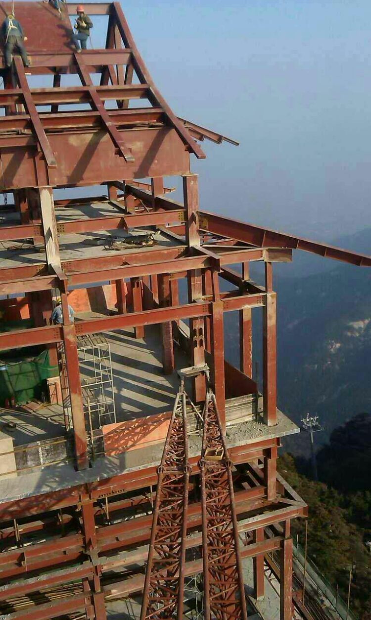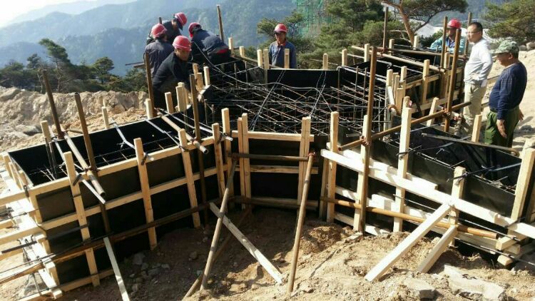 混凝土基礎(chǔ)澆鑄,因山地高差大,南側(cè)及東側(cè)柱子高度近20米,一直澆鑄到懸崖下面
