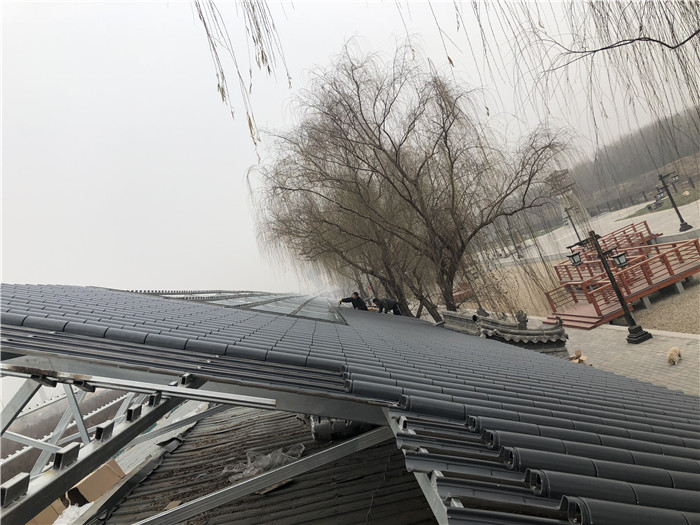 東申瓦業(yè)為西安市漢城湖景區(qū)供應(yīng)鋁合金仿古瓦,漢城湖屋面金屬瓦工程馬上完工,感謝選擇西安東申鋁瓦,景區(qū)工程金屬瓦;