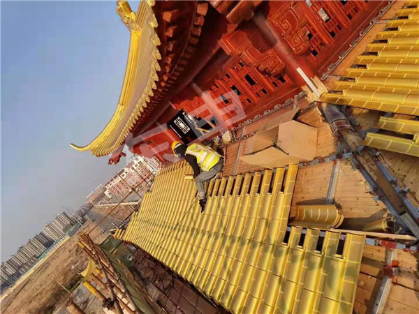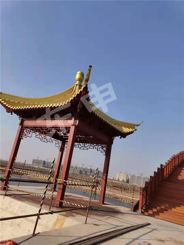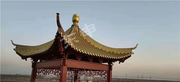 12月6日山東濱州飛虹閣鋁合金仿古瓦工程及涼亭工程供應(yīng),整體屋面全部采用東申瓦業(yè)鋁合金仿古瓦裝飾整體屋面,采用三號(hào)分體瓦,厚度為1.2mm;顏色為金色,面積約兩百多平方,整體安裝施工快,效率高;感謝選擇西安東申鋁合金仿古瓦,景區(qū)工程,仿古建筑屋面。