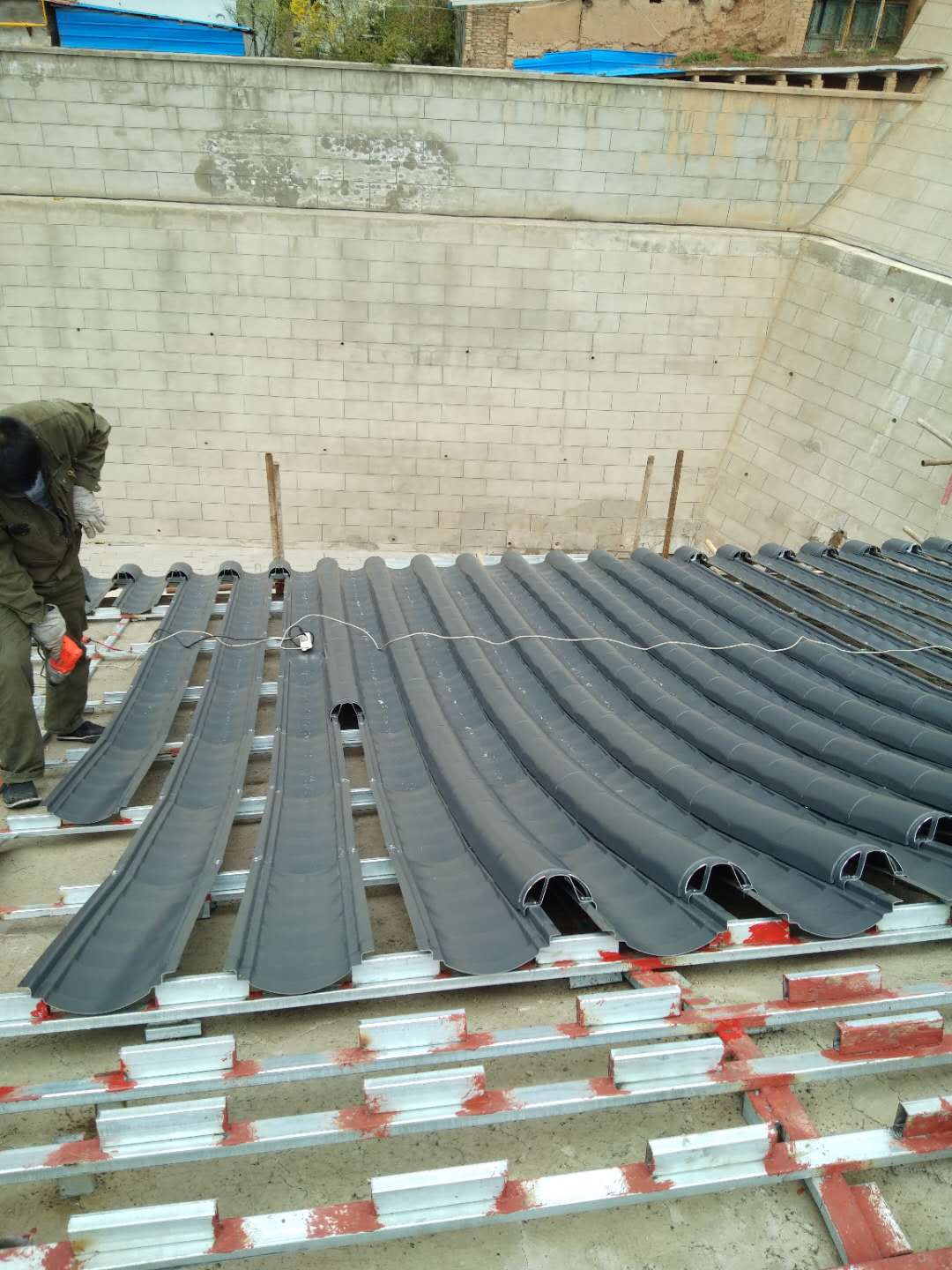 傳統(tǒng)的安裝方式,比較復(fù)雜,搭接方式比較繁瑣;東申仿古金屬瓦整體屋面采用龍骨搭接方式,打螺絲焊接安裝瓦,一個屋面基本一個星期就好,很清晰明了,屋面也很結(jié)實固定,就算地震也不怕,只要房子不倒,就沒有任何顧慮。