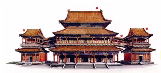 以多座建筑合組而成的宮殿、官署、廟宇,乃至于住宅,通常均取左右對稱之布局。一切組織均根據(jù)中線以發(fā)展,其布置秩序均為左右分立,適用與禮儀之莊嚴(yán)場合。公者如朝會大典,私者如婚喪喜慶。