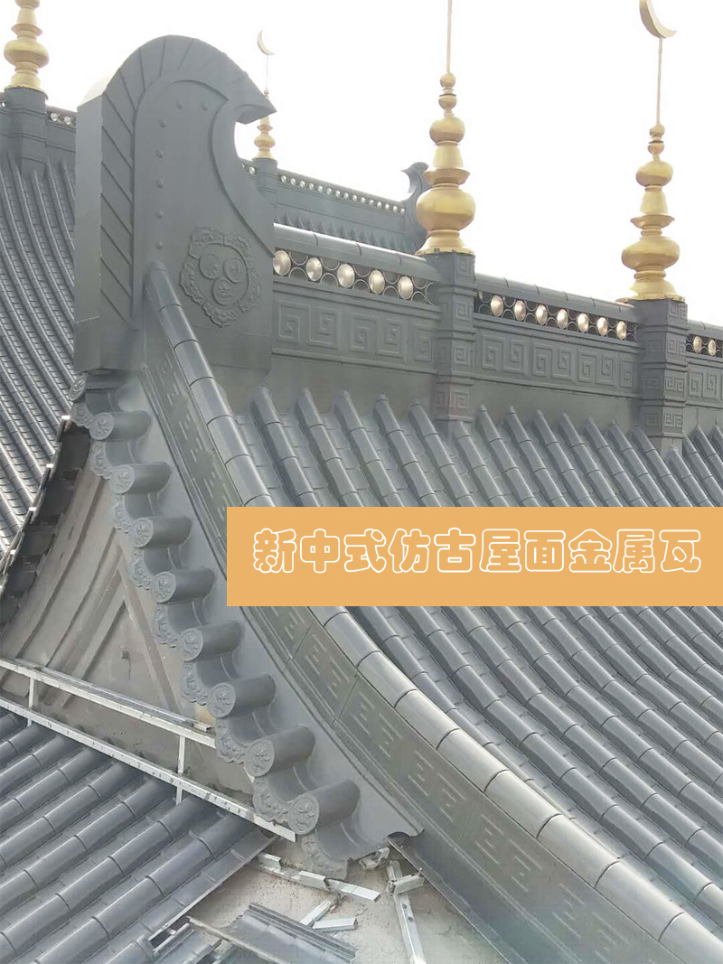 新中式仿古屋面金屬瓦在西寧,甘肅,這些地區(qū)的一些清真寺屋面已經(jīng)開始使用,清真寺的人員也已經(jīng)認可中式仿古屋面的這種風(fēng)格和瓦型,針對屋面改造來選用相應(yīng)的瓦片;
