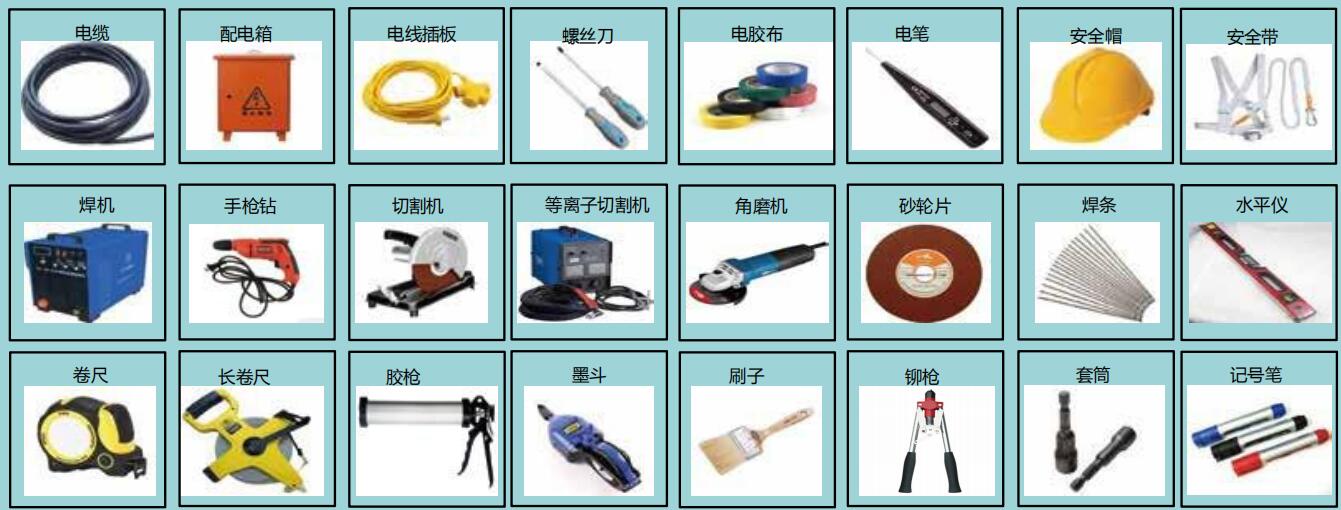 安裝及后期處理的工具有焊機(jī),手槍鉆,切割機(jī),等離子切割機(jī),角磨機(jī),砂輪片,焊條,水平儀,卷尺,長卷尺,膠槍,墨斗,刷子,鉚槍,套筒,記號(hào)筆等等;
