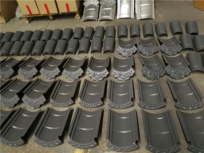 2.仿古金屬瓦一片一片的瓦片生產(chǎn)出來,工藝上更加仿古風(fēng)格,每種瓦片有自己的規(guī)格,安裝之前需要把屋面下面的預(yù)埋點(diǎn)多放一些,然后上面焊接龍骨來調(diào)平屋面的坡度,橫龍骨和豎龍骨,以及次龍骨比較密集,大螺絲安裝板瓦和筒瓦固定屋面;更加結(jié)實(shí);