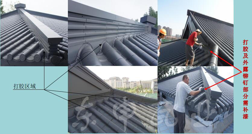 3.在施工完成后的細(xì)節(jié)是不可忽視的,最重要的就是要檢查整個(gè)屋面的紕漏,每個(gè)螺絲以及瓦之間的銜接有沒有縫隙之類的要盡快處理掉,不然后期處理就很麻煩,安裝在乎細(xì)節(jié);然后就是給有縫隙的地方打膠密封,和補(bǔ)漆具體做法如下: