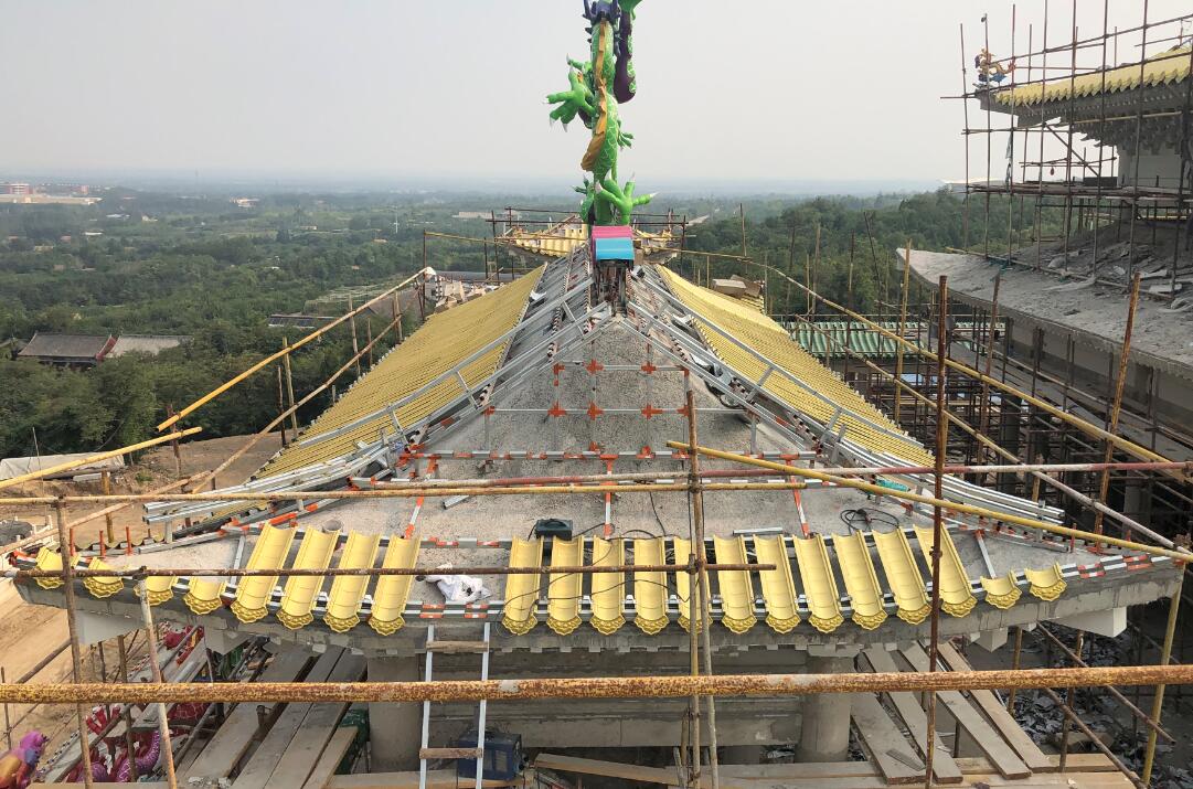 金屬鋁鎂錳仿古瓦的重量是傳統(tǒng)瓦的十分之一,很多古老的寺廟已經(jīng)舊瓦漏雨漏的不行了,但是呢,又不想把屋面全部給拆了;拆了了的話,里面很多東西要搬走,修好后,又要搬回來,來來回回,比較,麻煩;鋁鎂錳仿古瓦幫你解決問題,屋面可以不用拆,輕質(zhì)的金屬瓦直接在舊的屋面瓦上面搭接新的鋁鎂錳仿古瓦就可以了。