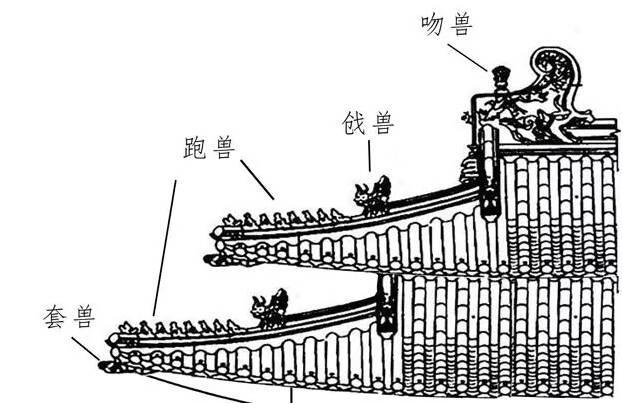 其中,正脊上安放吻獸或望獸,垂脊上安放垂獸,戧脊上安放戧獸,另在屋脊邊緣處安放仙人走獸。