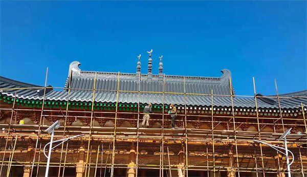 青海民和縣下梁平清真寺大殿仿古瓦工程完工,主要選用2號分體瓦,材質(zhì)為鋁鎂錳合金;厚度:1.2mm;面積900平方;風格為新中式仿古風格;作為地勢比較高的西北高原,青海地區(qū)的主任考慮到,當?shù)貧夂虺D甑娘L吹干旱,海波高,選用耐候性的較好的鋁合金仿古瓦。