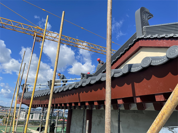 遼寧渤海閣屋面鋁瓦,斗拱,方椽安裝順利完工,選用東申2號分體鋁瓦,厚度1.5mm,顏色:磨砂灰色;面積約3000平方。風(fēng)格為仿古唐風(fēng);感謝渤海閣老總對東申瓦業(yè)的信任和支持。