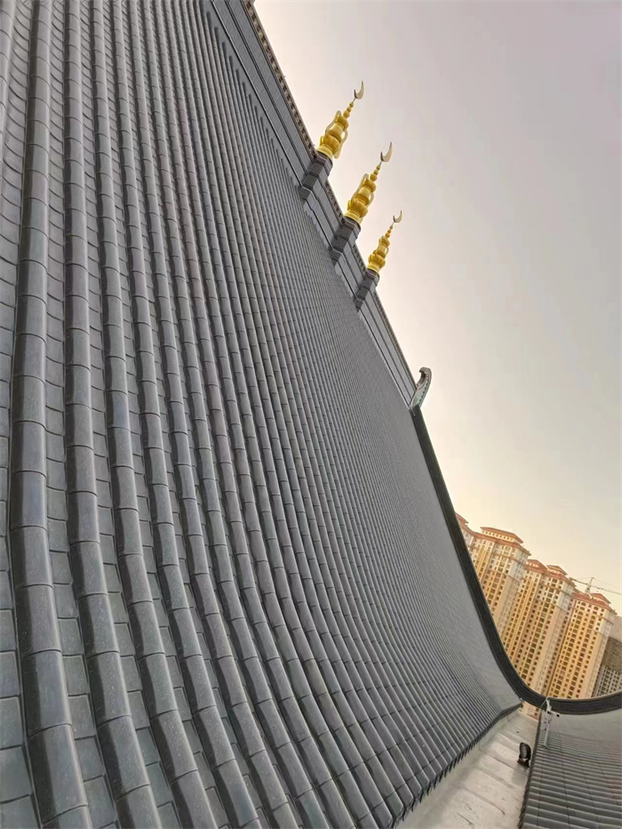 青海西寧民和南清真大寺屋面鋁瓦工程,選用東申瓦業(yè),2號分體瓦,厚度:1.2mm;顏色灰色;面積約2600平方;風(fēng)格為新中式仿古風(fēng)格。