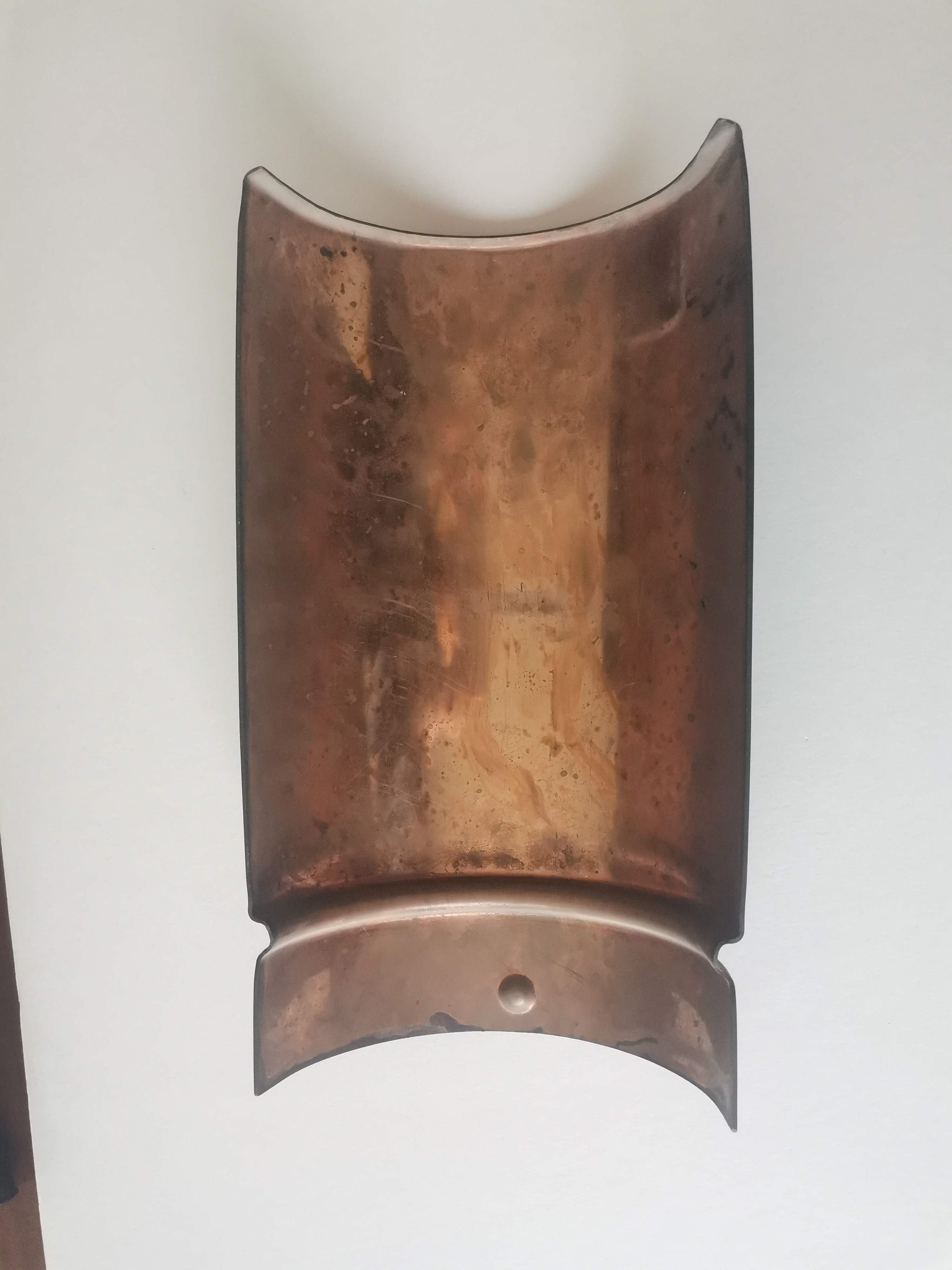生產(chǎn)方式很簡單,技術(shù)也很初級,大家可以看到非常簡單的設(shè)計;特別是筒瓦的設(shè)計也是靠一個一個打螺絲打上去的連接方式;這個是銅瓦的樣品。整體的瓦當?shù)嗡彩菦_壓成型的。