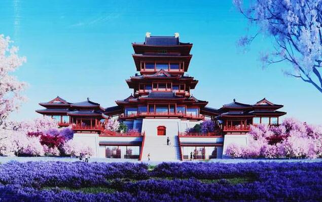 散花閣的中心樓閣采用唐代樓閣風(fēng)貌,屋面出檐、翼角起翹、平座斗拱、建筑臺基等,充分體現(xiàn)唐代建筑風(fēng)貌要素。各層四面分別設(shè)置寬大門廊和歇山抱廈,在豐富建筑造型的基礎(chǔ)上以體現(xiàn)芙蓉花的花團(tuán)錦簇。