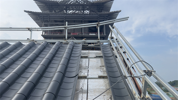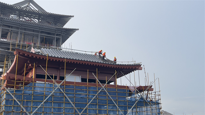 成都散花閣屋面鋁鎂錳合金瓦正在施工中。。。整個閣樓選用東申所生產(chǎn)鋁鎂錳合金瓦,及仿古屋面的吻獸,寶鼎;瓦的厚度1.2mm;款式為2號分體瓦;屋面瓦面積約為7000平方米;顏色為灰色;風(fēng)格為唐代風(fēng)格。