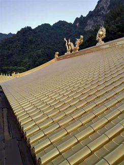 這個屋面為觀音閣屋面的鋁合金瓦為分體鋁瓦,屋面整體顏色為金色,遠觀一副金光燦爛的畫,盡收眼底。