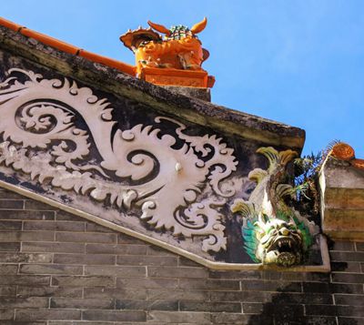 不僅中國宮殿里有這種滴水神獸,越南的順化皇城也毫不例外,在兩處屋頂?shù)慕唤犹,裝飾了一個巨大的龍形滴水神獸,在滿足排水的功能外,在敬畏天地鬼神的年代,其辟邪壓勝的象征意義,還給居住者一種精神上的慰藉。