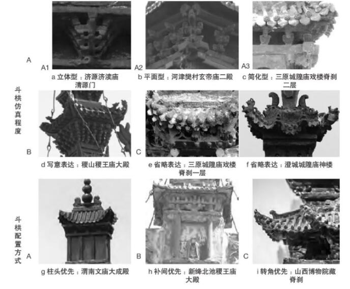 斗栱構(gòu)件過于精細(xì),捏塑時難以準(zhǔn)確表現(xiàn),因而刻意淡化,按仿真度高低可分3類:1)真實表達(dá)(又分A1立體型,樣式與建筑所在地域往往有所關(guān)聯(lián);A2平面型,逐層前傾以示出跳;A3簡化型,僅在櫨斗內(nèi)安置耍頭間接示意);2)寫意表達(dá)(體現(xiàn)為外出尖角/下昂的如意斗栱);C省略表達(dá)(以塊體疊澀或纏枝、蓮瓣等替代)。配置方式則分為:A柱頭鋪作優(yōu)先(無補(bǔ)間);B補(bǔ)間鋪作優(yōu)先(開間較局促時會省略兩平柱上鋪作);3)轉(zhuǎn)角鋪作優(yōu)先(往往將柱頭鋪作轉(zhuǎn)過45o充任,并未三向出跳)。顯然,斗栱配置方式多樣而刻畫難度較高,本身并非屋型脊剎的描畫重點(圖10)。