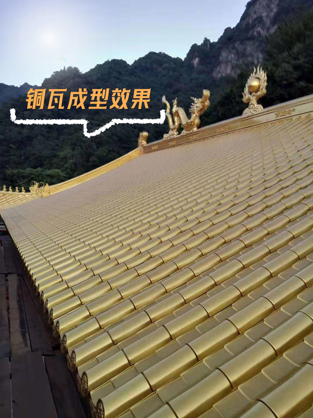 金屬銅瓦不同于傳統(tǒng)的陶瓦,琉璃瓦,樹脂瓦;單一從顏值上看,金屬銅瓦它紋理感和精細度更高;從表面看,金屬材質(zhì)的瓦,是通過沖壓成型的,在工藝上更精致一點;從外面上看,屋面更高級。特別對于金色的瓦,表面的氟碳漆里面加了金粉,從遠處看,就非常的金光燦燦;非常的美。