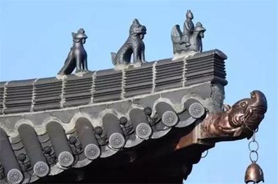 在中國古建筑中,屋脊是屋面的一個重要組成部分,也是屋頂?shù)闹匾b飾部位。特別是在皇家建筑或大型寺廟的主殿上,屋脊上都有一些獸形的裝飾瓦件,根據(jù)它們所處的位置不同,有不同的稱呼和定義。