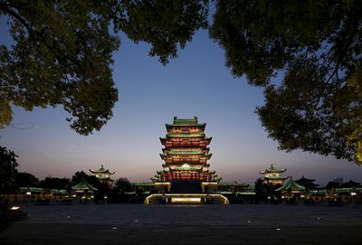 打亮坡屋面,同時(shí)照亮屋身的柱或墻,也是表達(dá)中國(guó)傳統(tǒng)建筑照明的一種方式。但采用相結(jié)合的照明,容易出現(xiàn)各部分均等照明或建筑所有部分都很亮的情況,因此,要注重建筑照明的明暗關(guān)系。
