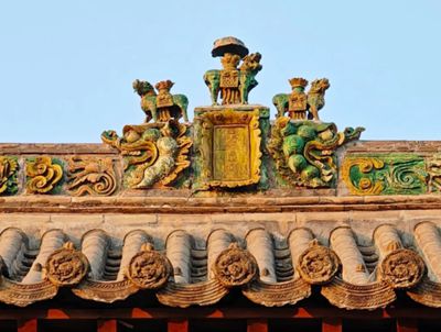 陽城湯王廟獻亭上的吻獸、脊飾、溝滴、排山、懸魚、博風(fēng)板等等都用琉璃作為裝飾件。根據(jù)屋頂吻獸背部題記可以知道其為明成化十七年本縣匠人所制;此類琉璃制品以白坩土為胎,施以黃、綠、藍、白、醬五色釉面;鴟吻上附著有一條小龍,昂首望天;鴟吻尾部類似于魚尾分叉,有遼代鴟吻的神韻;屋脊側(cè)的行龍姿態(tài)各異,垂脊下端塑有一條完整的行龍作垂獸,其面目猙獰,神態(tài)威武,而在四角處有嬪伽端莊的作為脊端,姿態(tài)威嚴雄壯。