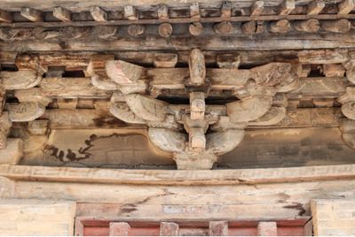 而從年代發(fā)展來看,年代越久遠的建筑,斗拱越大,補間鋪作越少,比如唐宋時期的建筑,斗拱層在整座建筑上占的比例較大,高度接近柱子的三分之一;