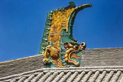 脊獸是一種用于古建筑屋脊上的構件,為神獸造型。雖然從結構上說它并非是最重要的一種構件,但脊獸位于屋頂高點、往往是視覺焦點,而且它兼具構造性和裝飾性,建筑等級越高的屋脊上通常也會設有更多脊獸。