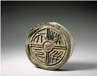 “千秋萬歲”文字瓦當(dāng)出土于漢陽陵,圓瓦中心有下周起圓芯,四方起雙陽線將當(dāng)面四等分,每格填有一字,為自右向左直讀書寫。十分巧妙地應(yīng)用文字作為裝飾,具有圖案美。當(dāng)面文字具有圖案化特征。邊際起有弦文,瓦當(dāng)邊沿平整寬厚。整體風(fēng)格自然、安詳、質(zhì)樸。