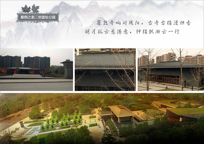 秦二世陵遺址公園位于西安曲江池遺址公園南岸,是區(qū)域景觀軸線(大雁塔—芙蓉園—曲江池—秦二世胡亥墓)的南端口,占地面積約70畝,其中建筑面積4714平方米。園區(qū)的主要建筑包括游客服務中心、展覽館主樓、展覽館副樓、秦二世陵墓等;功能內容上則集遺址保護、秦文化展示、觀光游覽、公共公園、消費休閑等多種功能于一體。園區(qū)的建筑風格具有秦風特色,以直線、幾何、陣列等簡潔的手法體現秦文化的壯美、力量和宏大,與其他唐韻園林形成顯著差異,成為曲江獨具特色的遺址公園。