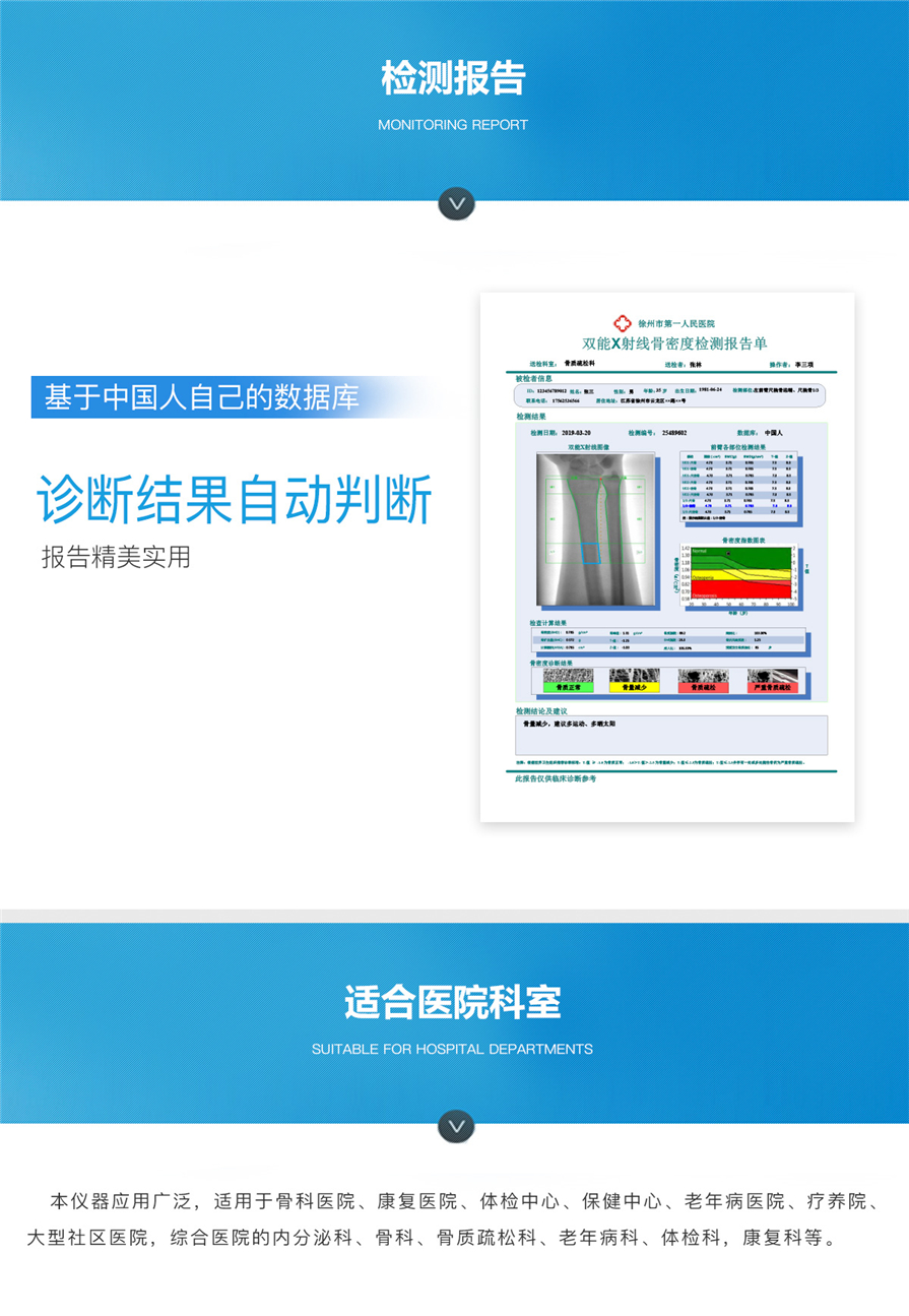 產(chǎn)品用途 本儀器應(yīng)用廣泛,適用于骨科醫(yī)院、康復(fù)醫(yī)院、體檢中心、保健中心、老年病醫(yī)院、療養(yǎng)院、大型社區(qū)醫(yī)院,綜合醫(yī)院的內(nèi)分泌科、骨科、骨質(zhì)疏松科、老年病科、體檢科、康復(fù)科等。